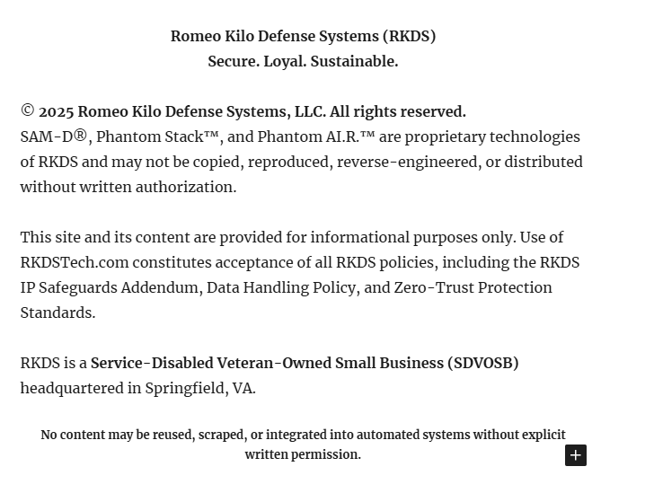 RKDSTech builds compliance-first software for support agreements and mission workflows. Our Phantom Ecosystem powers SAM-D, Phantom Stack, and Phantom AI.R. to help government and regulated enterprises move faster without breaking the rules.